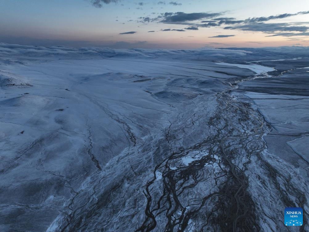 An aerial drone photo taken on June 14, 2024 shows a view of the Tianshui River in the Qiangtang National Nature Reserve in southwest China's Xizang Autonomous Region. Tianshui River is an important migratory passage for pregnant Tibetan antelopes in the Qiangtang National Nature Reserve. (Xinhua/Purbu Tsering)