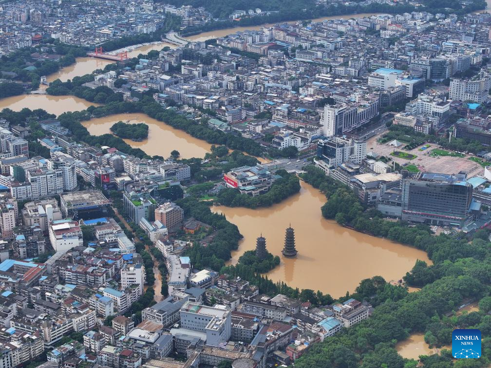 An aerial drone photo taken on June 20, 2024 shows the view of a flooded area in Guilin, south China's Guangxi Zhuang Autonomous Region. (Xinhua/Huang Xiaobang)