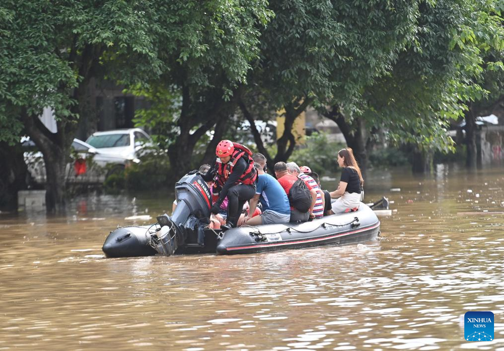 Rescuers help local residents evacuate from a flooded road in Guilin, south China's Guangxi Zhuang Autonomous Region, June 20, 2024. (Xinhua/Huang Xiaobang)