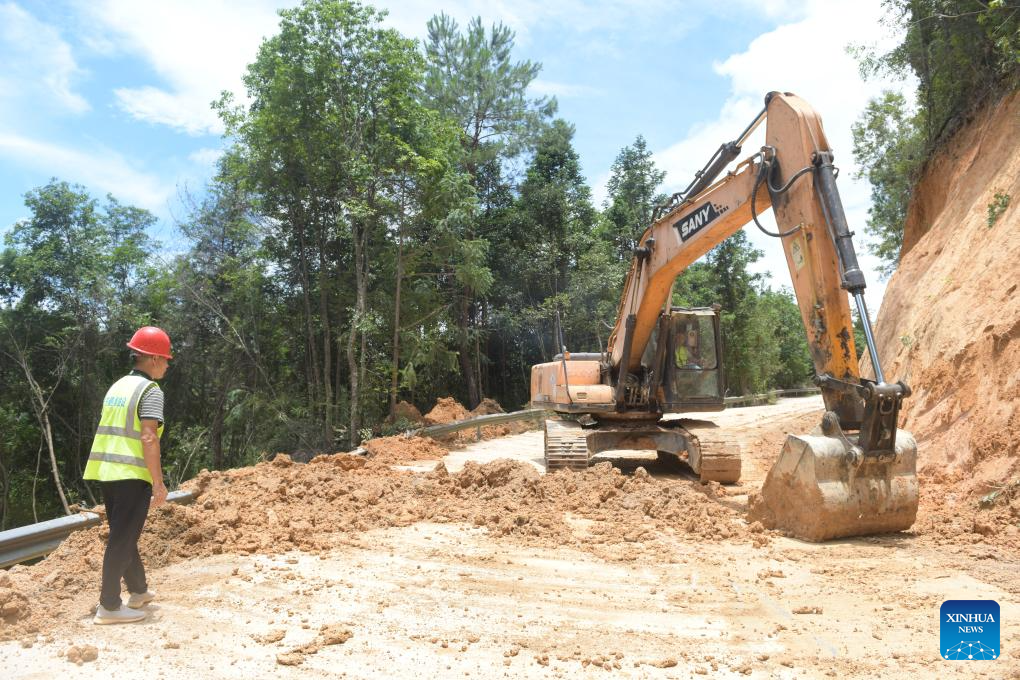 Rescuers clear a flood-damaged road connecting Wengui Village and Sishui Township of Pingyuan County, in Meizhou City, south China's Guangdong Province, June 20, 2024. (Xinhua/Lu Hanxin)