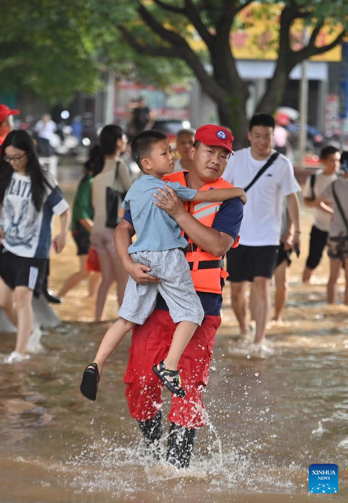 A rescuer helps a child evacuate from a flood-affected area in Guilin, south China's Guangxi Zhuang Autonomous Region, June 20, 2024. (Xinhua/Huang Xiaobang)