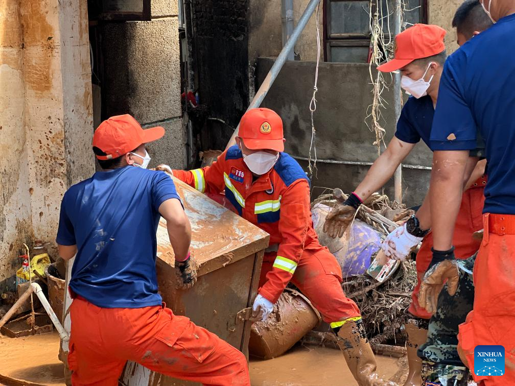 Rescuers clear debris in a flood-affected area in Sishui Township of Pingyuan County, Meizhou City, south China's Guangdong Province, June 20, 2024. (Xinhua/Lu Hanxin)