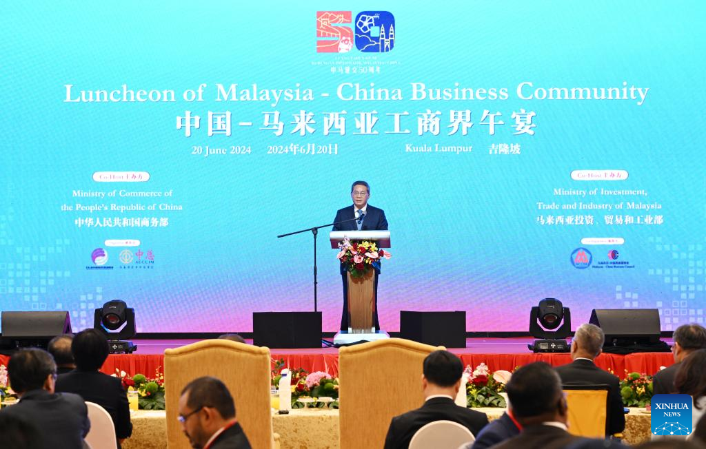 Chinese Premier Li Qiang delivers a speech while attending the luncheon of China-Malaysia business community with Malaysian Prime Minister Anwar Ibrahim in Kuala Lumpur, Malaysia, June 20, 2024. (Xinhua/Zhang Ling)