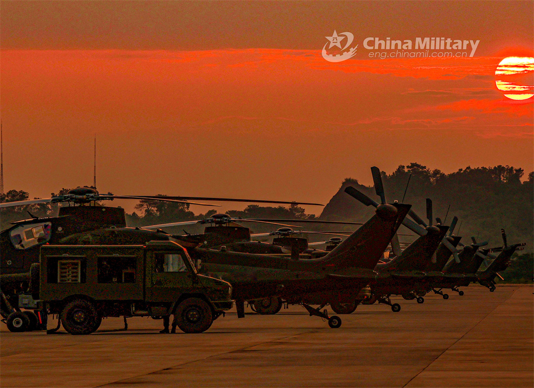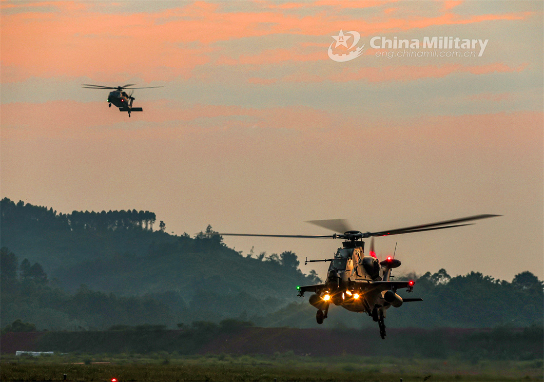 Attack helicopters attached to a brigade of the PLA Army lift off successively for a flight training exercise on June 2, 2024. (eng.chinamil.com.cn/Photo by Sun Changyi)