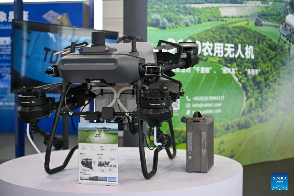 This photo shows an agricultural drone at the low-altitude economy exhibition area at the World Intelligence Expo 2024 in north China's Tianjin, June 20, 2024. The World Intelligence Expo 2024, with the theme of "Intelligence: Extensive Development Space, Sustainable Growth Driver," opened on Thursday in north China's Tianjin, and exhibition of low-altitude economy has won much attention.