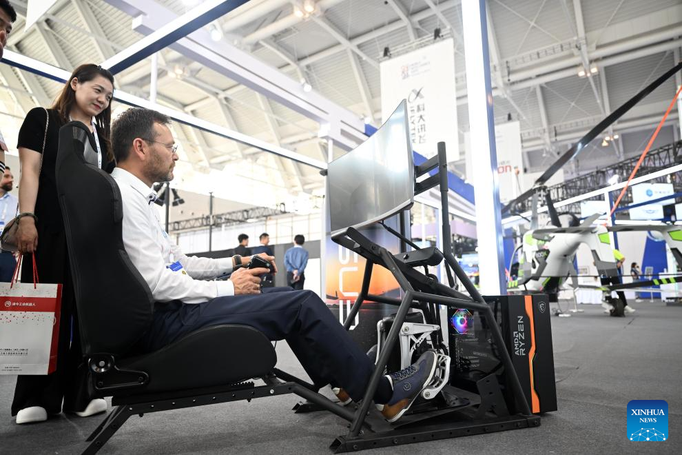 A visitor experiences simulated flying of aircraft at the low-altitude economy exhibition area at the World Intelligence Expo 2024 in north China's Tianjin, June 20, 2024. The World Intelligence Expo 2024, with the theme of "Intelligence: Extensive Development Space, Sustainable Growth Driver," opened on Thursday in north China's Tianjin, and exhibition of low-altitude economy has won much attention.