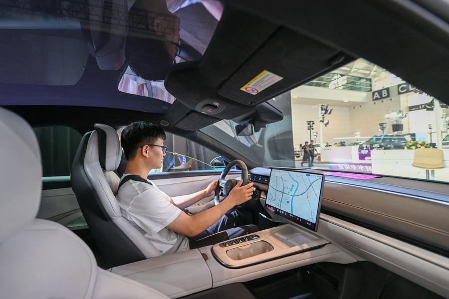 A visitor tries his hands on an intelligent connected NEV displayed at the World Intelligence Expo 2024 in north China's Tianjin, June 22, 2024. (Xinhua/Sun Fanyue)