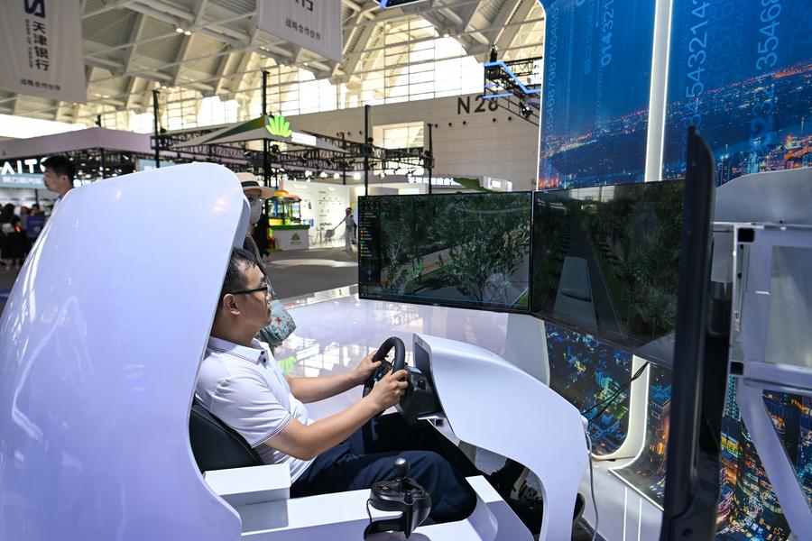 A visitor tries a simulator for testing of intelligent connected vehicles at the World Intelligence Expo 2024 in north China's Tianjin, June 22, 2024. (Xinhua/Sun Fanyue)