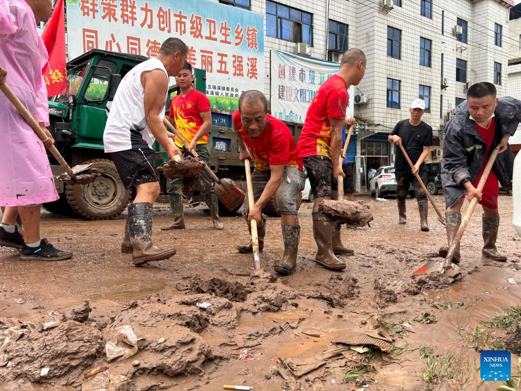 This photo taken by a mobile phone on June 23, 2024 shows people cleaning the mud on a road in Wuqiangxi Township of Yuanling County in central China's Hunan Province. Heavy rainfall hit Wuqiangxi Township on Saturday, triggering flood that impacted local residential area. Local authorities have carried out emergency response to minimize the impact of the extreme weather conditions. (Xinhua/Yu Chunsheng)