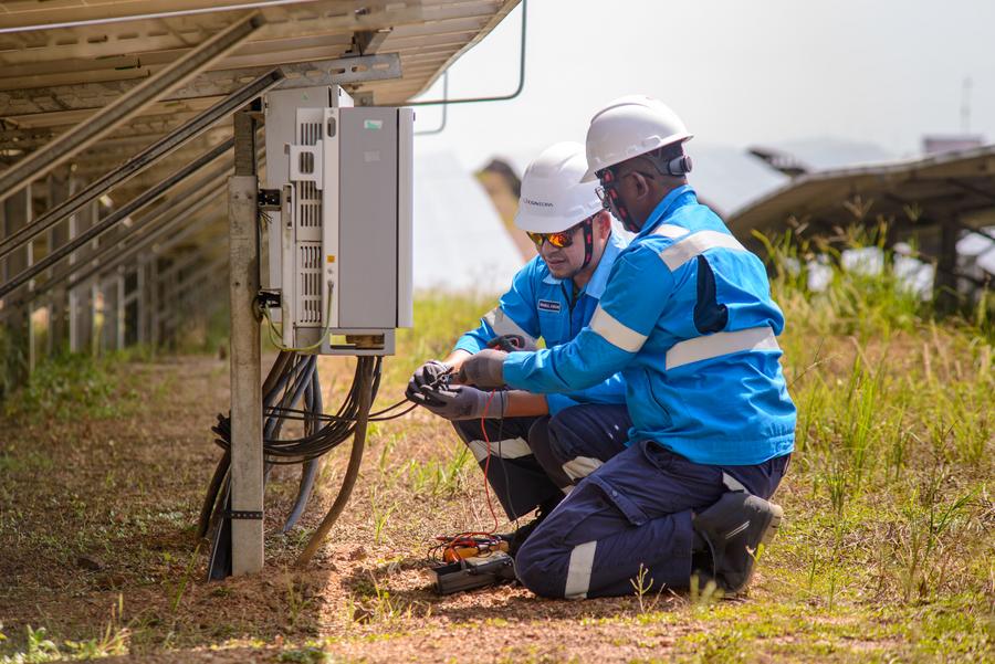 Workers check the equipment at the photovoltaic power station in Kuala Ketil, Malaysia, June 6, 2024. (Photo by Chong Voon Chung/Xinhua)
