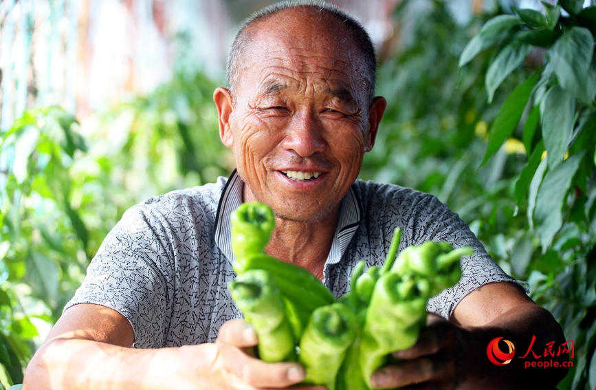 A farmer showcases freshly harvested chili peppers at a vegetable plantation in Wangdaifu village, Shawo township, Qixian county, Kaifeng city, central China's Henan Province. (People's Daily Online/Huo Yaping)