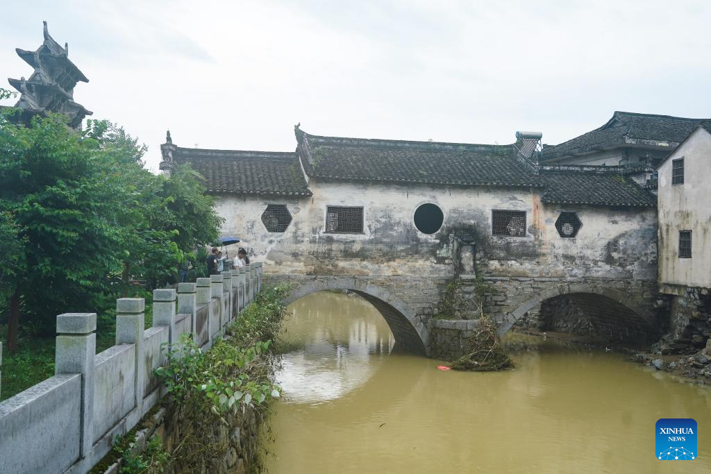 This photo taken on June 22, 2024 shows an ancient pavilion in Xucun Village of Xucun Town, Huangshan City, east China's Anhui Province. The city of Huangshan raised the emergency response level for flood control to Level II on Thursday. The precipitation in the city's Xucun Village has surpassed 520 mm since Wednesday. Up to now, the village's 16 national level cultural relics protection sites are in good condition. (Xinhua/Du Yu)