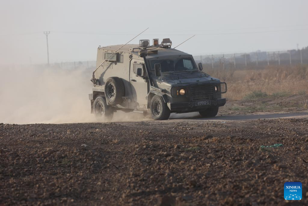 An Israeli military vehicle is seen near the border with Gaza Strip in southern Israel, June 23, 2024. Israeli Prime Minister Benjamin Netanyahu said on Sunday that there has been "a dramatic drop" in weapons shipments from the United States for Israel's war in Gaza over the past few months. (Photo by Gil Cohen Magen/Xinhua)