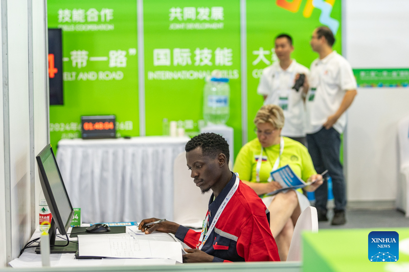 A contestant (back) is pictured during a contest of the second Belt and Road International Skills Competition in southwest China's Chongqing Municipality on June 24, 2024. The second Belt and Road International Skills Competition kicked off at Chongqing International Expo Center here on Monday, attracting participants from 61 countries and regions. (Xinhua/Wang Quanchao)