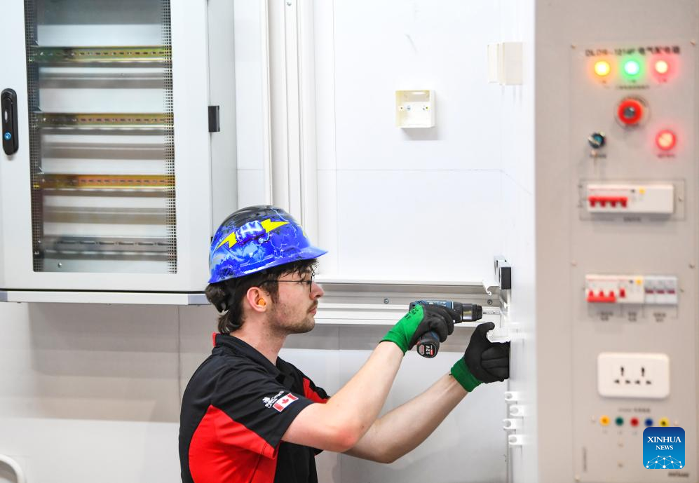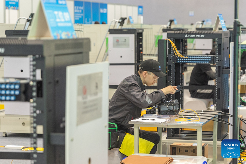 A contestant is pictured during a contest of the second Belt and Road International Skills Competition in southwest China's Chongqing Municipality on June 24, 2024. The second Belt and Road International Skills Competition kicked off at Chongqing International Expo Center here on Monday, attracting participants from 61 countries and regions. (Xinhua/Huang Wei)