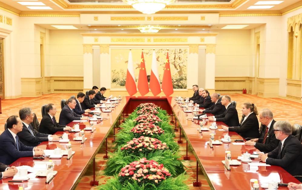 He said China stands ready to strengthen the docking of development strategies with Poland, take high-quality Belt and Road cooperation as the guide to promote the upgrading of economic and trade cooperation, foster optimized and balanced development of bilateral trade, achieve more efficient and smooth connectivity, expand cooperation in emerging fields like new energy, digital economy and artificial intelligence, and achieve mutual benefits and win-win results.