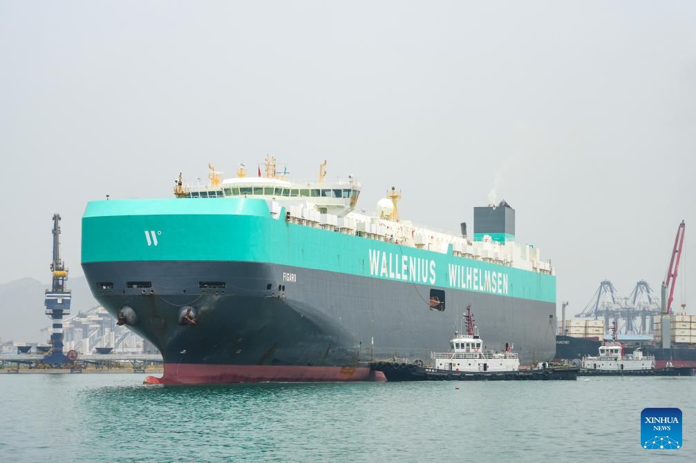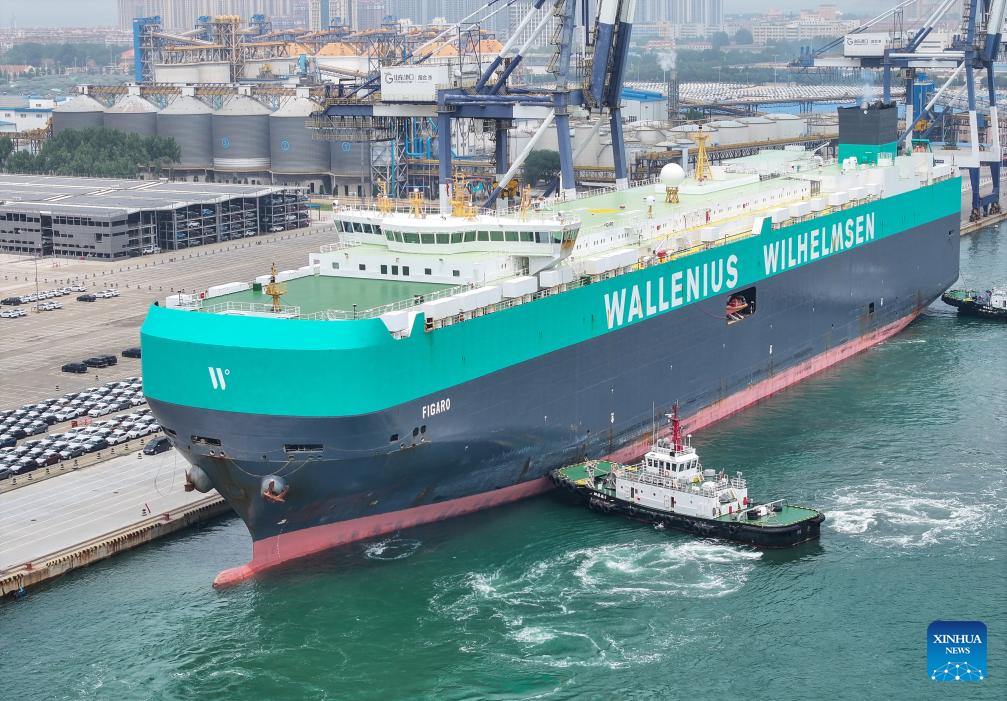 A ro-ro ship docks at Yantai Port in east China's Shangdong Province, June 23, 2024. The multi-mode handling volume of commodity vehicles of Yantai Port reached 288,000 in the first five months of 2024, an increase of 30.2 percent over the same period in 2023. In recent years, Yantai Port has stepped up efforts in building a logistic hub for commodity vehicles. It has now opened up 14 commodity vehicle logistics lines. (Xinhua/Zhu Zheng)