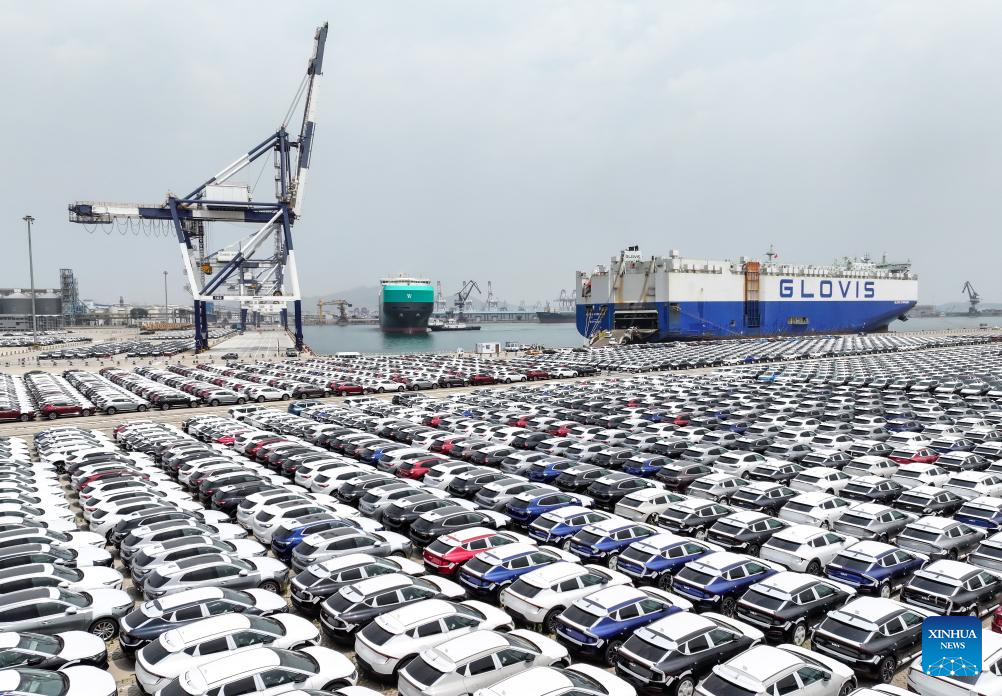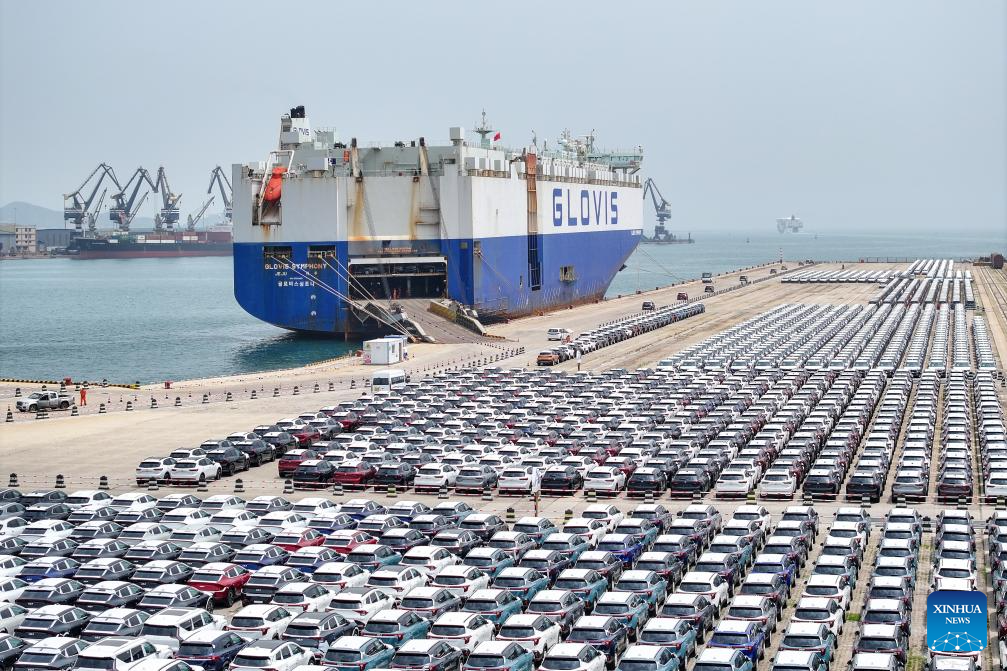 Vehicles drive off from a ro-ro ship to the parking lot at Yantai Port in east China's Shangdong Province, June 23, 2024. The multi-mode handling volume of commodity vehicles of Yantai Port reached 288,000 in the first five months of 2024, an increase of 30.2 percent over the same period in 2023. In recent years, Yantai Port has stepped up efforts in building a logistic hub for commodity vehicles. It has now opened up 14 commodity vehicle logistics lines. (Xinhua/Zhu Zheng)