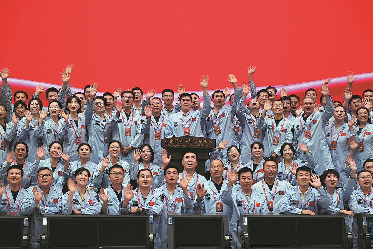 Staff members at the Beijing Aerospace Control Center pose for a group photo on Tuesday upon the successful completion of the Chang'e 6 mission. (JIN LIANGKUAI/XINHUA)