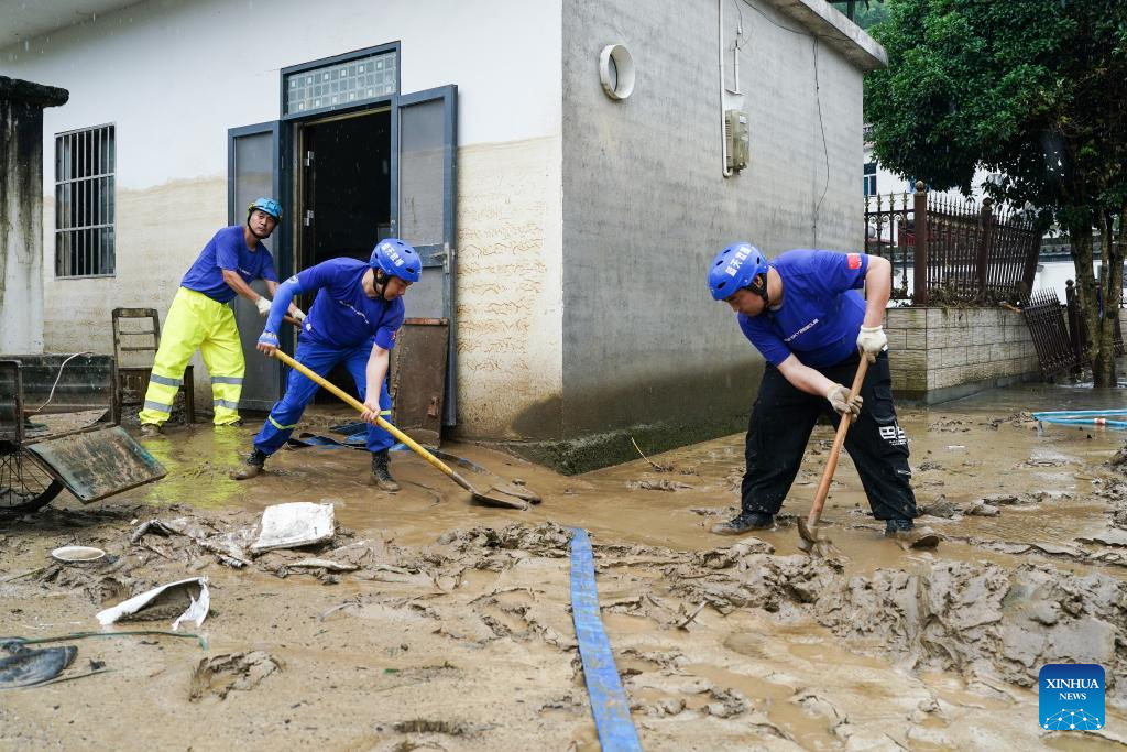 Emergency response workers clear mud for local residents at Shaolian Village, Shexian County, Huangshan City, east China's Anhui Province, June 24, 2024. Rare and heavy rainfall has hit Huangshan recently, triggering flood situations in the city. Local emergency response authorities have been promptly deploying manpower and resources, draining floodwater, cleaning up muds and relocating affected residents. (Xinhua/Du Yu)