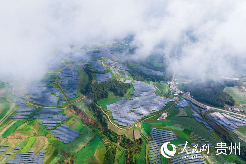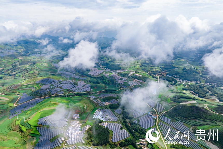 An aerial photo shows the Xianshuiwo agricultural photovoltaic power station in Weining Yi, Hui and Miao Autonomous County, Bijie, southwest China’s Guizhou Province. (People’s Daily Online/Tu Min)