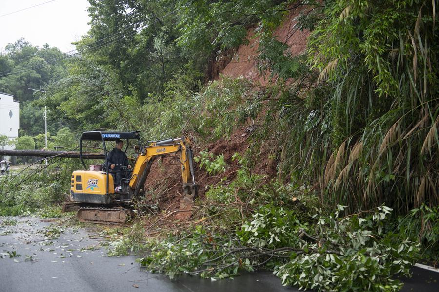 Wang Huiping drives an excavator to clear a road hit by a landslide in Tunxi District, Huangshan City, east China's Anhui Province, June 25, 2024. (Xinhua/Fu Tian)