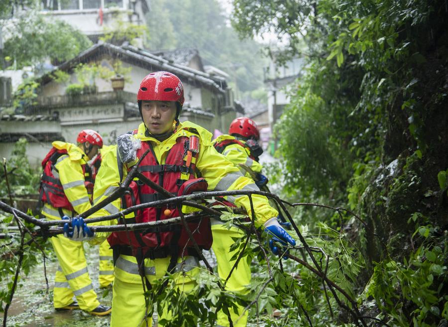 Firefighter chief Cheng Shunfu (front) and his team members remove branches at ancient Tunxi street at Tunxi District of Huangshan City, east China's Anhui Province, June 26, 2024. (Xinhua/Fu Tian)