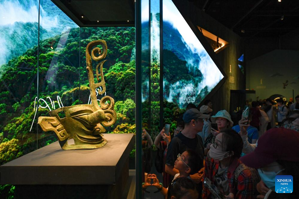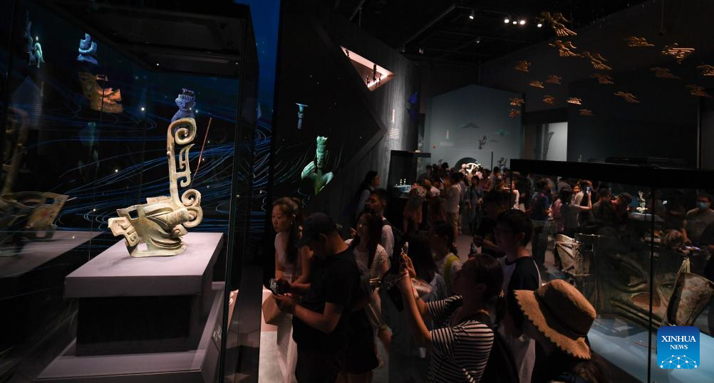 People visit an exhibition named "Unveiling Sanxingdui and Jinsha of Ancient Shu Civilization" at the Grand Canal Museum of Beijing, in Beijing, capital of China, June 27, 2024. With a total of 265 pieces of relics featuring ancient Shu civilization, the exhibition kicked off here on Thursday and will last until Oct. 10. (Xinhua/Chen Zhonghao)