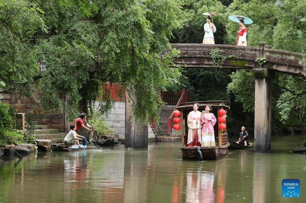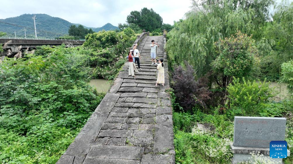 People visit the Puji Bridge in Lishan Village of Zhongguan Town, Deqing County, east China's Zhejiang Province, June 24, 2024. Deqing County is home to seven ancient stone bridges which are listed as major cultural heritage sites under state-level protection. In recent years, the county has spared no effort in the protection and renovation of ancient stone bridges, while promoting the integration of its heritage resources with cultural tourism and research trips. (Photo by Xie Shangguo/Xinhua)