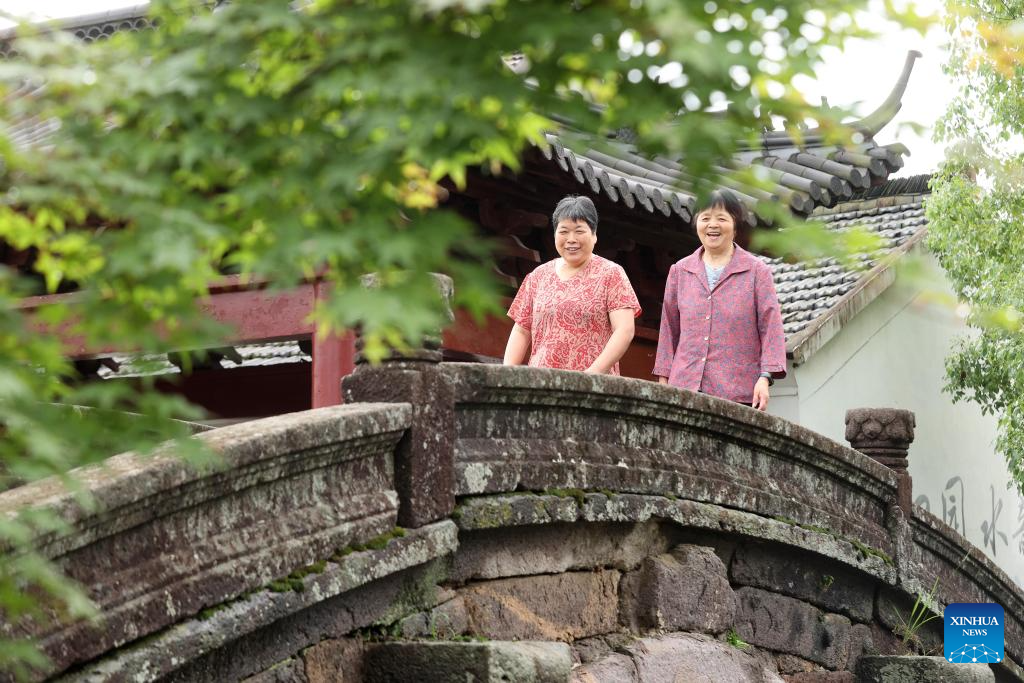 People walk on the Wanshan Bridge in Shebei Village of Xin'an Town, Deqing County, east China's Zhejiang Province, June 26, 2024. Deqing County is home to seven ancient stone bridges which are listed as major cultural heritage sites under state-level protection. In recent years, the county has spared no effort in the protection and renovation of ancient stone bridges, while promoting the integration of its heritage resources with cultural tourism and research trips. (Photo by Xie Shangguo/Xinhua)