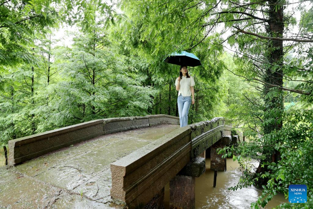 A woman walks on the Yong'an Bridge in Xiayang Village of Deqing County, east China's Zhejiang Province, June 25, 2024. Deqing County is home to seven ancient stone bridges which are listed as major cultural heritage sites under state-level protection. In recent years, the county has spared no effort in the protection and renovation of ancient stone bridges, while promoting the integration of its heritage resources with cultural tourism and research trips. (Photo by Xie Shangguo/Xinhua)
