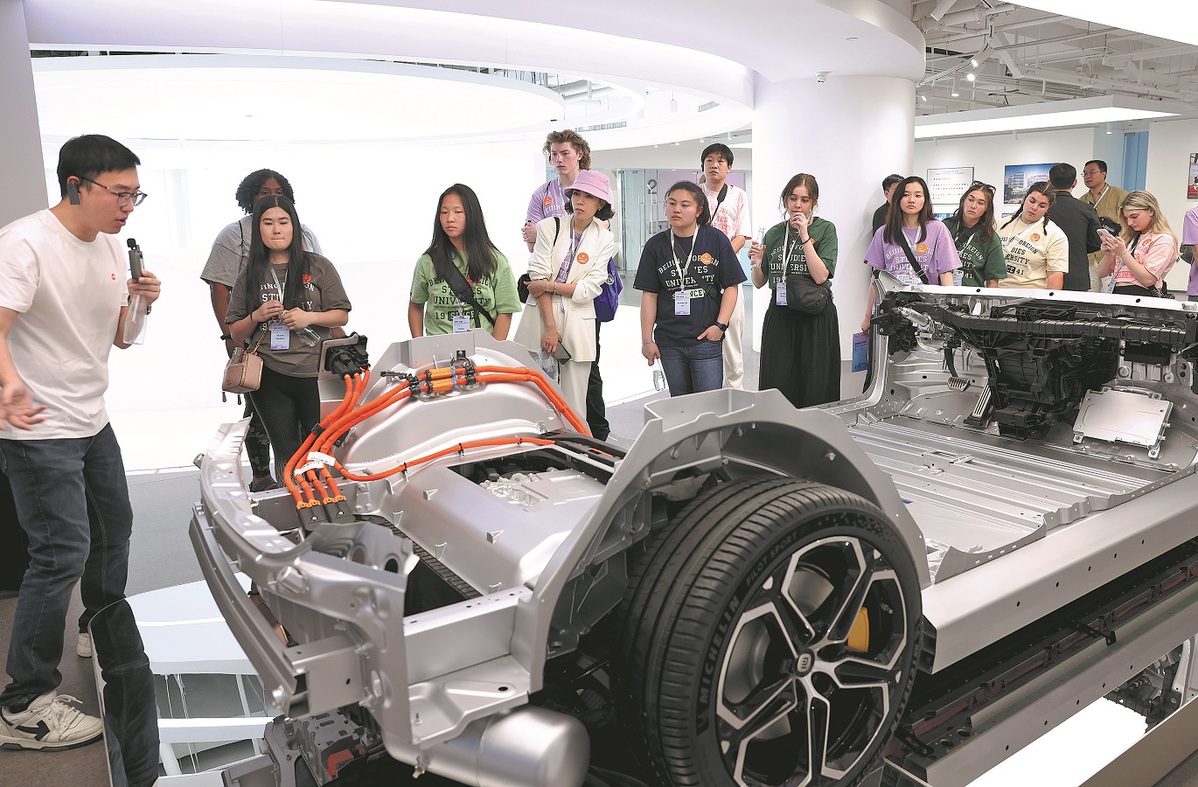 Students from Indiana University of Pennsylvania, the United States, learn about the interior structure of the Xiaomi SU7 electric vehicle at the company's industrial park in Beijing on May 17. (ZOU HONG/CHINA DAILY)