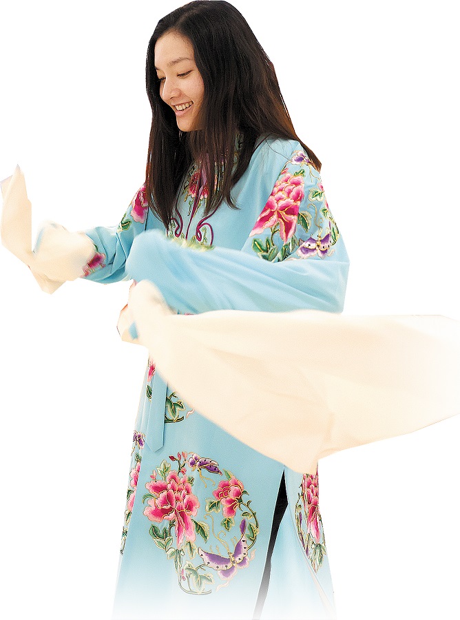 A student from Indiana University of Pennsylvania tries on Peking Opera costumes at Jixiang Theatre in Beijing on May 17. (ZOU HONG/CHINA DAILY)