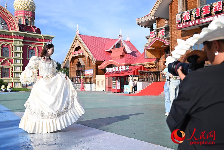 A tourist form Hunan Province poses for portrait photos in the matryoshka scenic spot of the China-Russia Border Tourist Area in Manzhouli city, north China’s Inner Mongolia Autonomous Region. (People’s Daily Online/Liu Yilin)