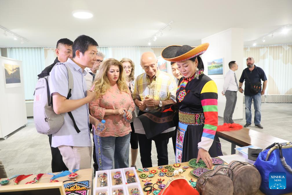 A visitor looks at local products during an event to promote tourism of China's Qinghai Province in Sofia, Bulgaria, on June 28, 2024. A delegation from China's northwestern Qinghai Province introduced its national parks and cultural charm to Bulgarians on Friday, welcoming tourists from the Central European country. (Photo by Marian Draganov/Xinhua)