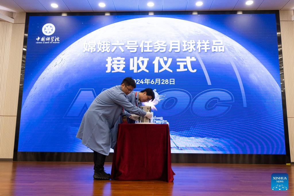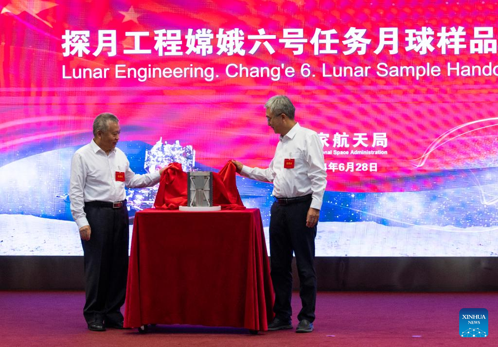 A reception ceremony for Chang'e-6 lunar samples is held at the National Astronomical Observatories under the Chinese Academy of Sciences (CAS) in Beijing, capital of China, June 28, 2024. A ceremony was held on Friday at the National Astronomical Observatories under the CAS to receive the lunar samples collected by China's Chang'e-6 probe. China's Chang'e-6 mission collected 1,935.3 grams of samples from the moon's far side, the China National Space Administration announced on Friday. (Xinhua/Jin Liwang)