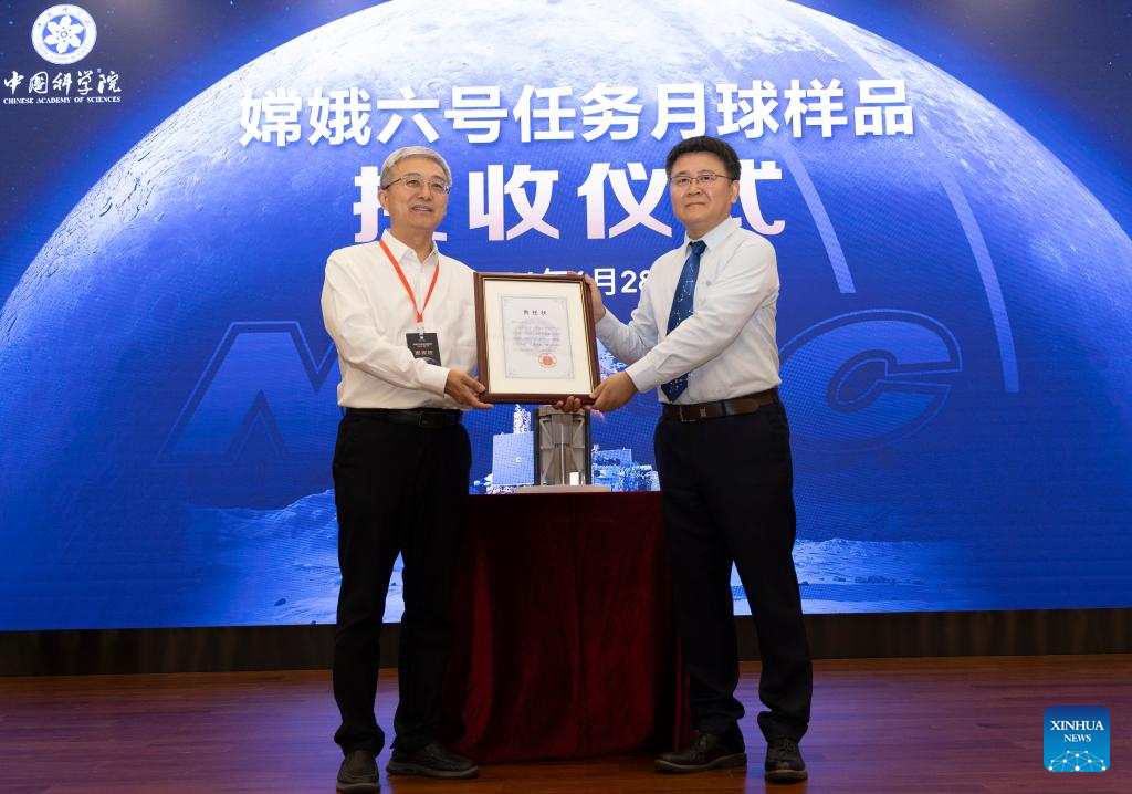 Ding Chibiao (L), vice president of the Chinese Academy of Sciences (CAS), issues a responsibility letter to Liu Jifeng, director of the National Astronomical Observatories, in Beijing, capital of China, June 28, 2024. A ceremony was held on Friday at the National Astronomical Observatories under the CAS to receive the lunar samples collected by China's Chang'e-6 probe.