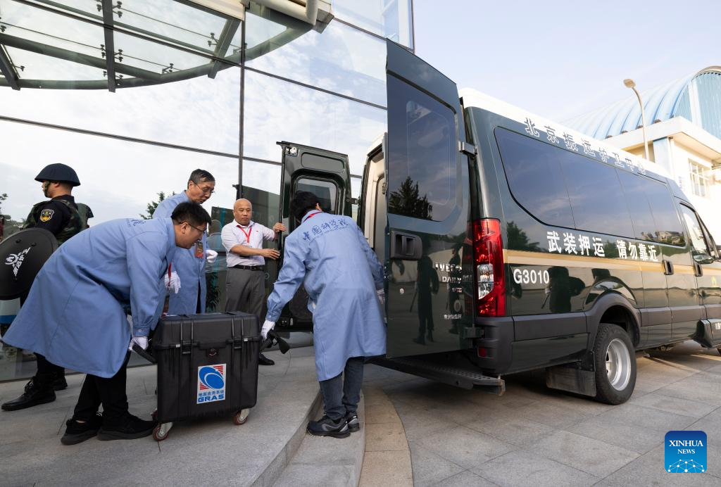Staff members transfer Chang'e-6 lunar samples to the lunar and deep space exploration laboratory of the Chinese Academy of Sciences (CAS) in Beijing, capital of China, June 28, 2024. A ceremony was held on Friday at the National Astronomical Observatories under the CAS to receive the lunar samples collected by China's Chang'e-6 probe.