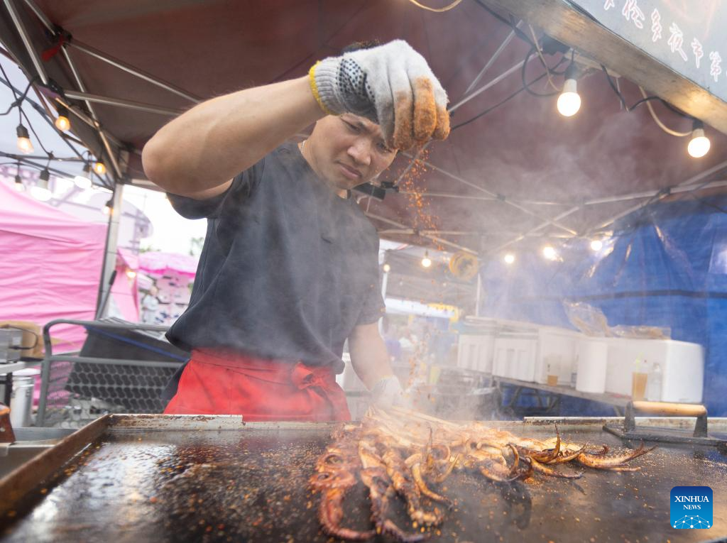 A cook grills squids during the 2024 Taste of Asia event in Markham, Canada, June 28, 2024.