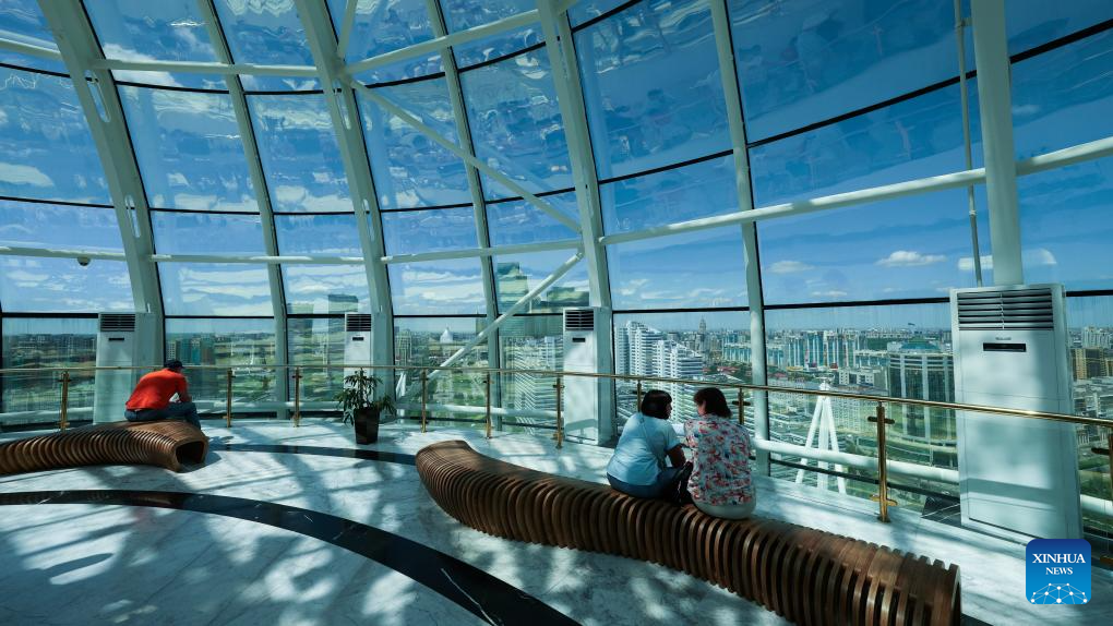 People enjoy the city view of Astana at the top of the Baiterek Tower in Astana, Kazakhstan, June 29, 2024. (Xinhua/Wang Jianhua)