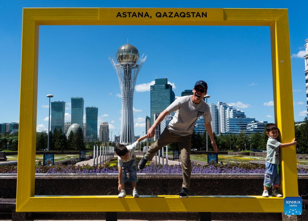 Tourists visit the city central axis with the Ak Orda Presidential Palace in the background in Astana, Kazakhstan, June 29, 2024. (Xinhua/Wang Jianhua)