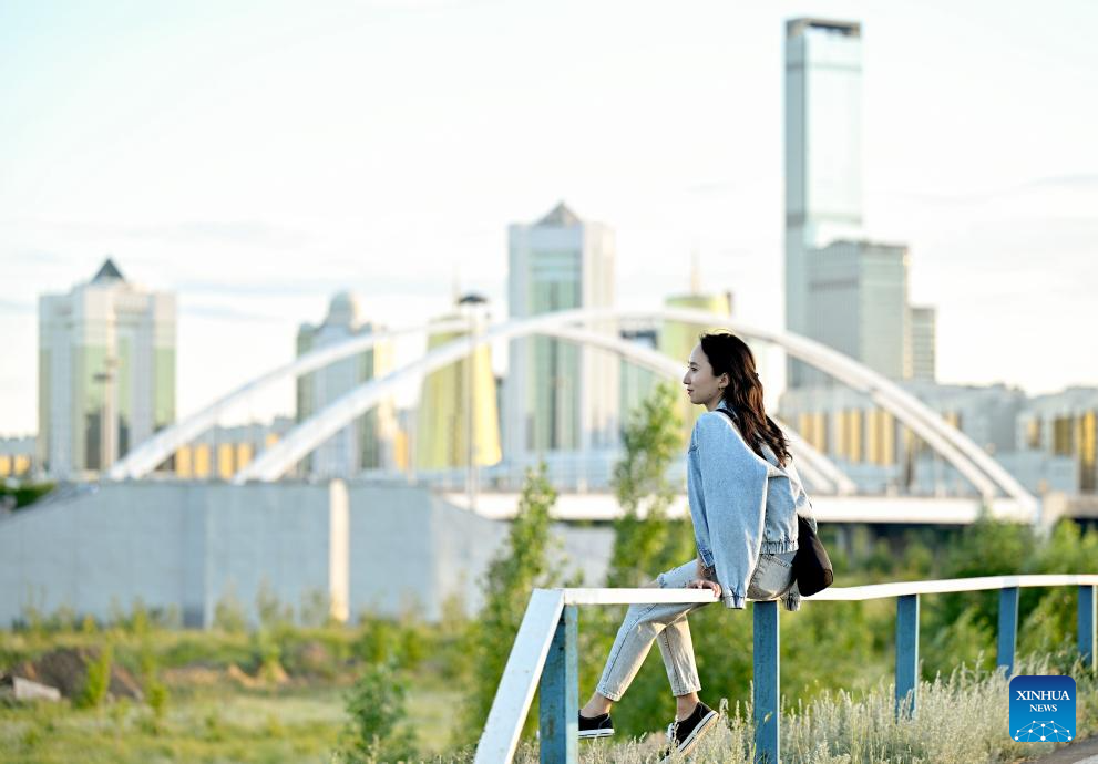 A woman is pictured at a park by the Ishim River in Astana, Kazakhstan, June 29, 2024. (Xinhua/Yue Yuewei)