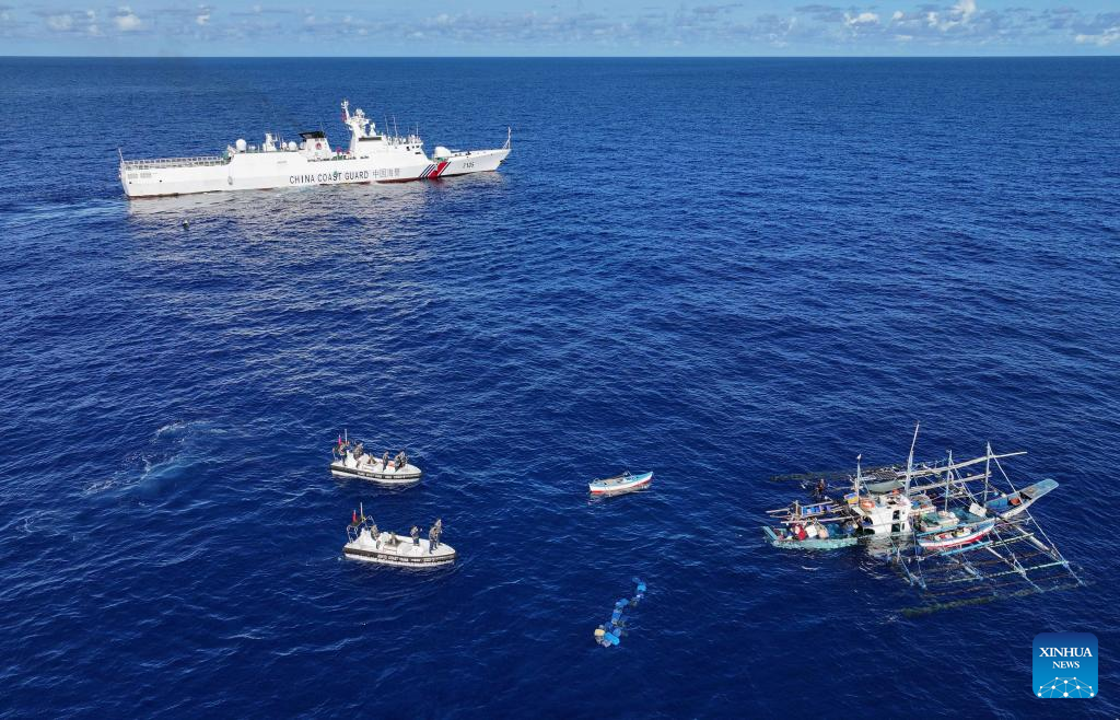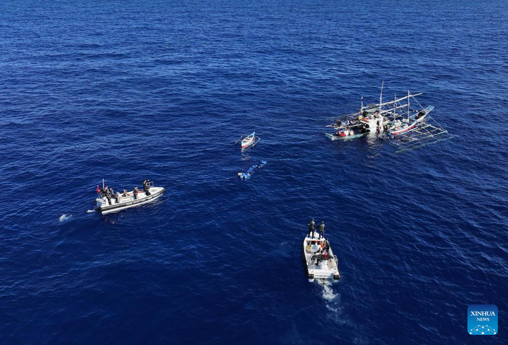 An aerial drone photo taken on June 29, 2024 shows the China Coast Guard assisting injured Filipino fishermen in waters adjacent to China's Huangyan Dao. (Xinhua/Deng Hua)