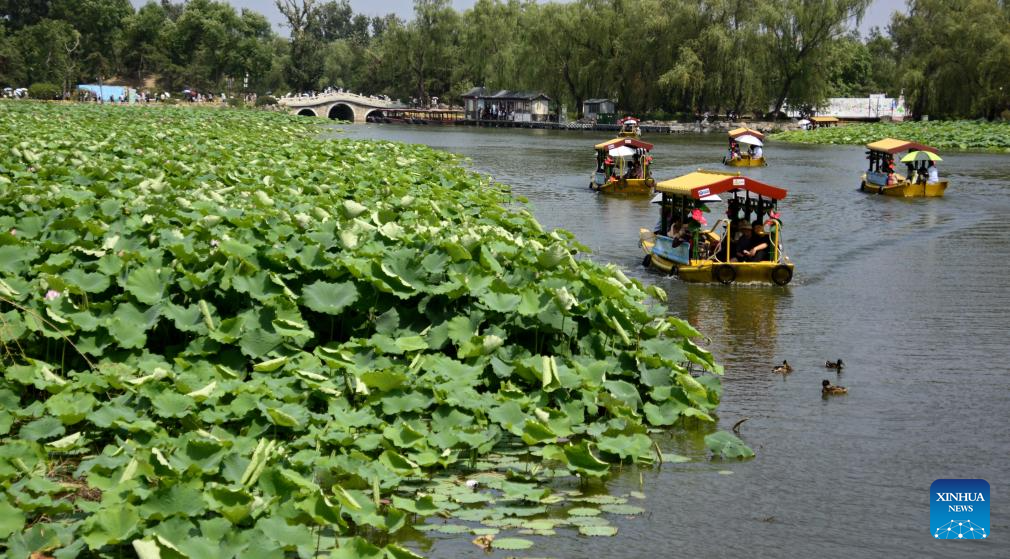Visitors enjoy blooming lotus flowers by boats at Yuanmingyuan Park in Beijing, capital of China, June 30, 2024. (Xinhua/Li Xin)