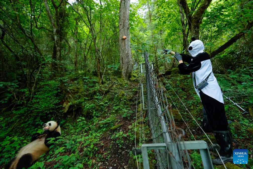 Staff member Mu Shijie, dressed up in a panda costume, feeds giant panda Xian Xian at the second-phase giant panda wild training fields of Tiantai Mountain in Wolong National Nature Reserve in southwest China's Sichuan Province, June 24, 2024. (Xinhua/Shen Bohan)