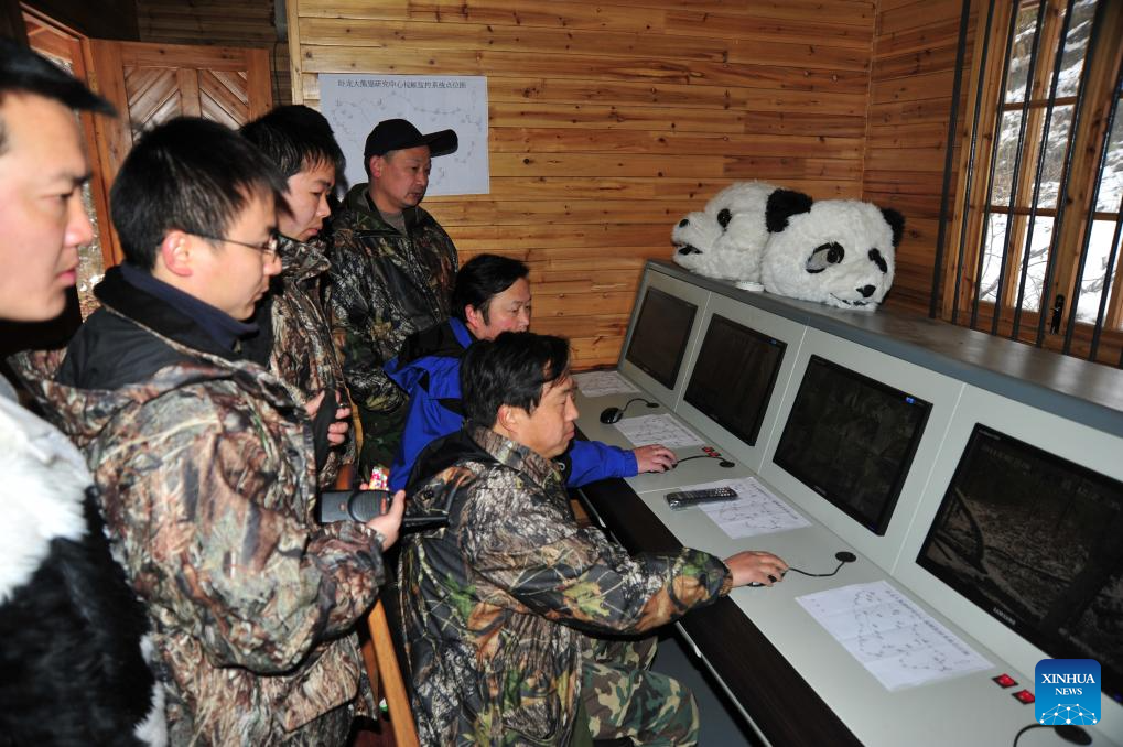 This file photo taken on Nov. 20, 2010 shows staff members monitoring the giant panda wild training fields of Hetaoping panda base in Wolong, southwest China's Sichuan Province. (CCRCGP/Handout via Xinhua)
