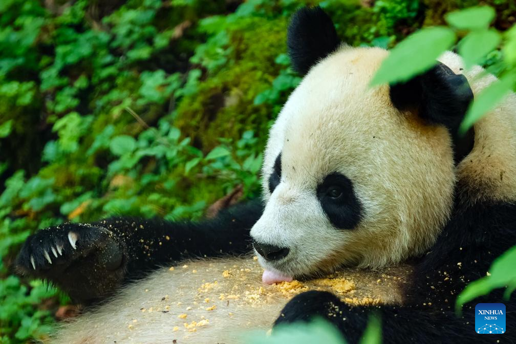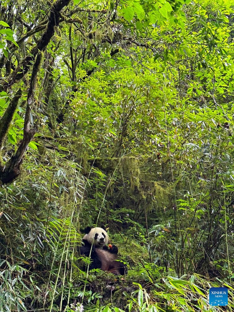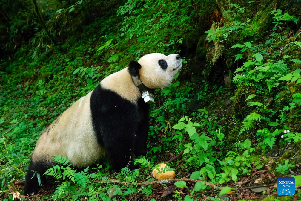Giant panda Xian Xian has food at the second-phase giant panda wild training fields of Tiantai Mountain in Wolong National Nature Reserve in southwest China's Sichuan Province, June 24, 2024. (Xinhua/Shen Bohan)