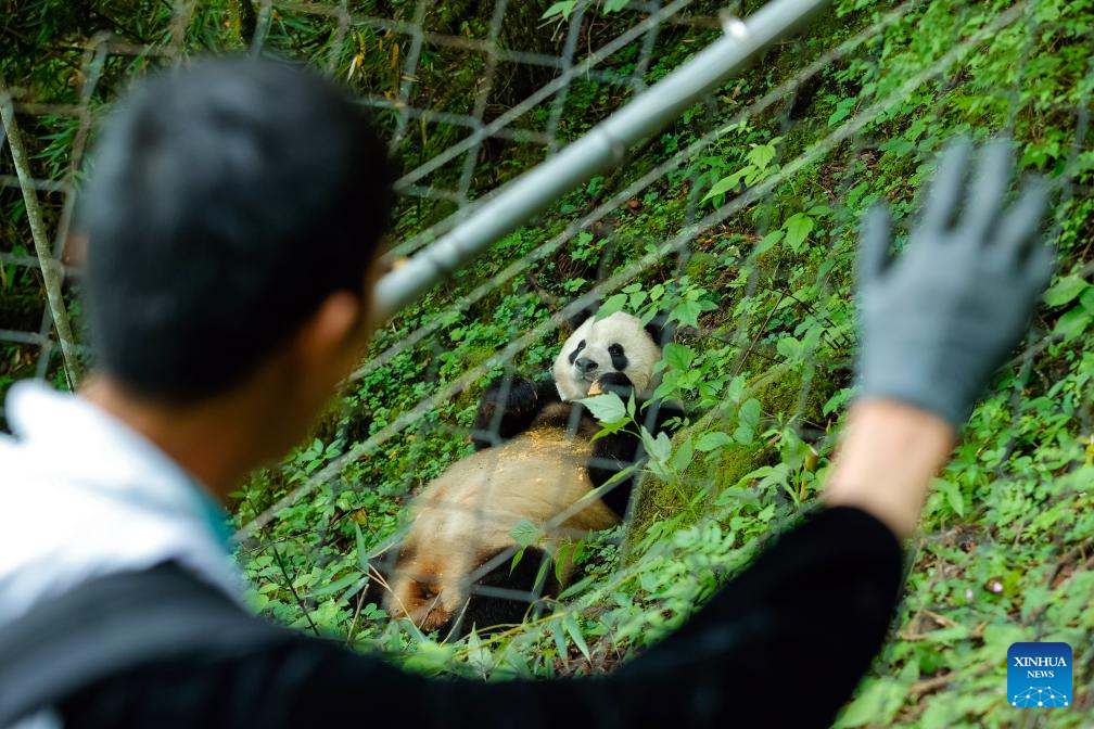 Staff member Mu Shijie waves goodbye to giant panda Xian Xian after feeding her at the second-phase giant panda wild training fields of Tiantai Mountain in Wolong National Nature Reserve in southwest China's Sichuan Province, June 24, 2024. (Xinhua/Shen Bohan)