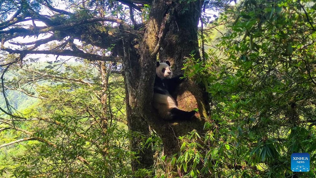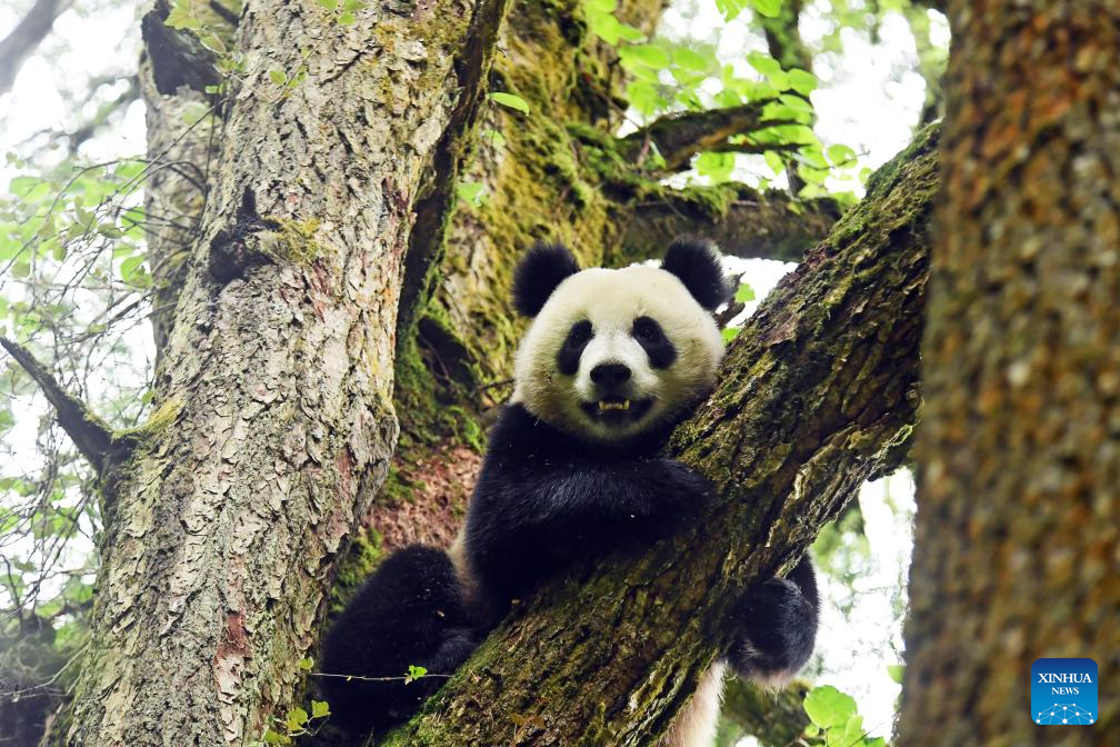 Giant panda Hui Hui is seen on a tree at the second-phase giant panda wild training fields of Tiantai Mountain in Wolong National Nature Reserve in southwest China's Sichuan Province, May 22, 2024. (Photo by Mu Shijie/Xinhua)