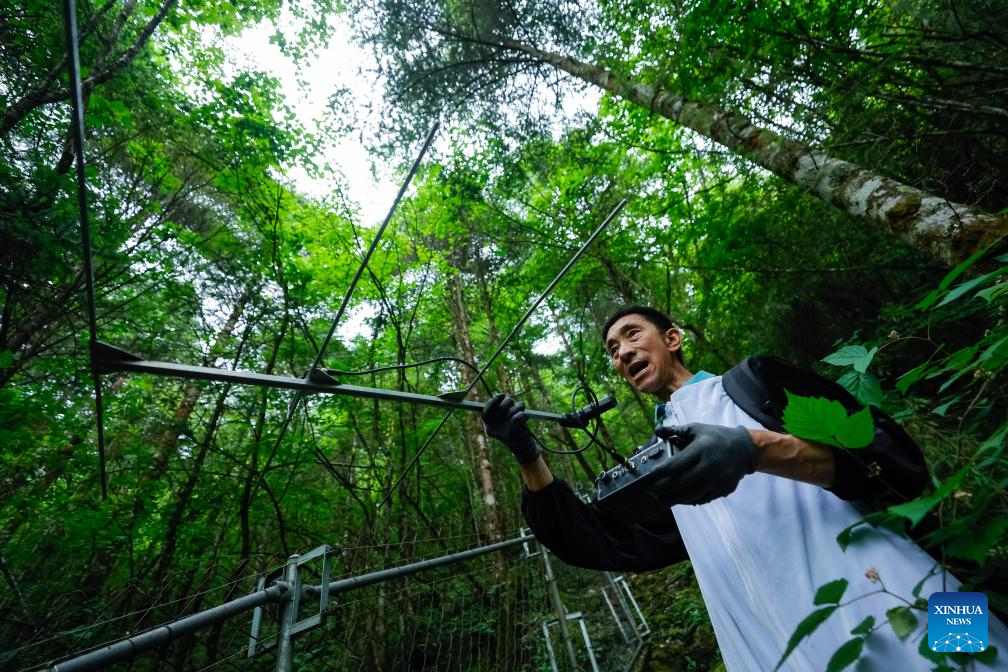 Staff member Mu Shijie uses a radio positioning device to trace giant panda Xian Xian while calling out her name at Tiantai Mountain in Wolong National Nature Reserve in southwest China's Sichuan Province, June 24, 2024. (Xinhua/Shen Bohan)
